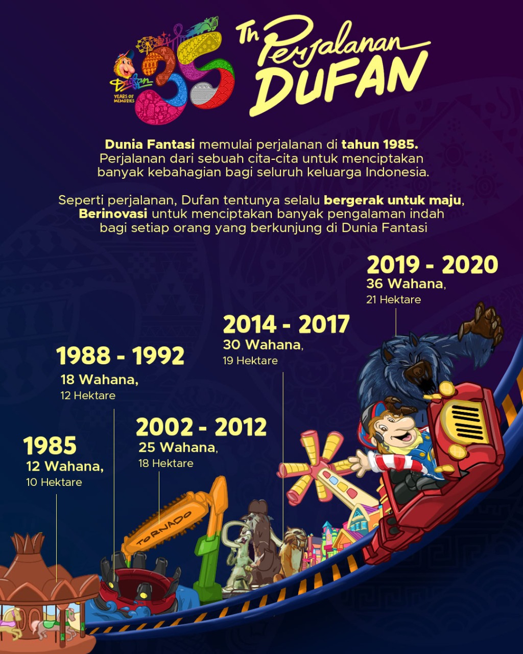 Dengan motto inovasi tiada henti, kini area bermain yang memiliki keistimewaan di hati masyarakat melengkapinya dengan 36 wahana dengan kawasan yang lebih luas lagi yaitu 21 hektar. Tentunya adanya perluasan kawasan dan penambahan wahana ini tidak lain hanya ingin menjadikan kawasan Dunia Fantasi sebagai destinasi wisata dan liburan yang dapat dinikmati oleh seluruh anggota keluarga. Sebab kini tidak hanya kalangan remaja saja yang dapat menikmatinya, tetapi seluruh anggota keluarga termasuk anak-anak di kawasan terbaru Dunia Kartun.