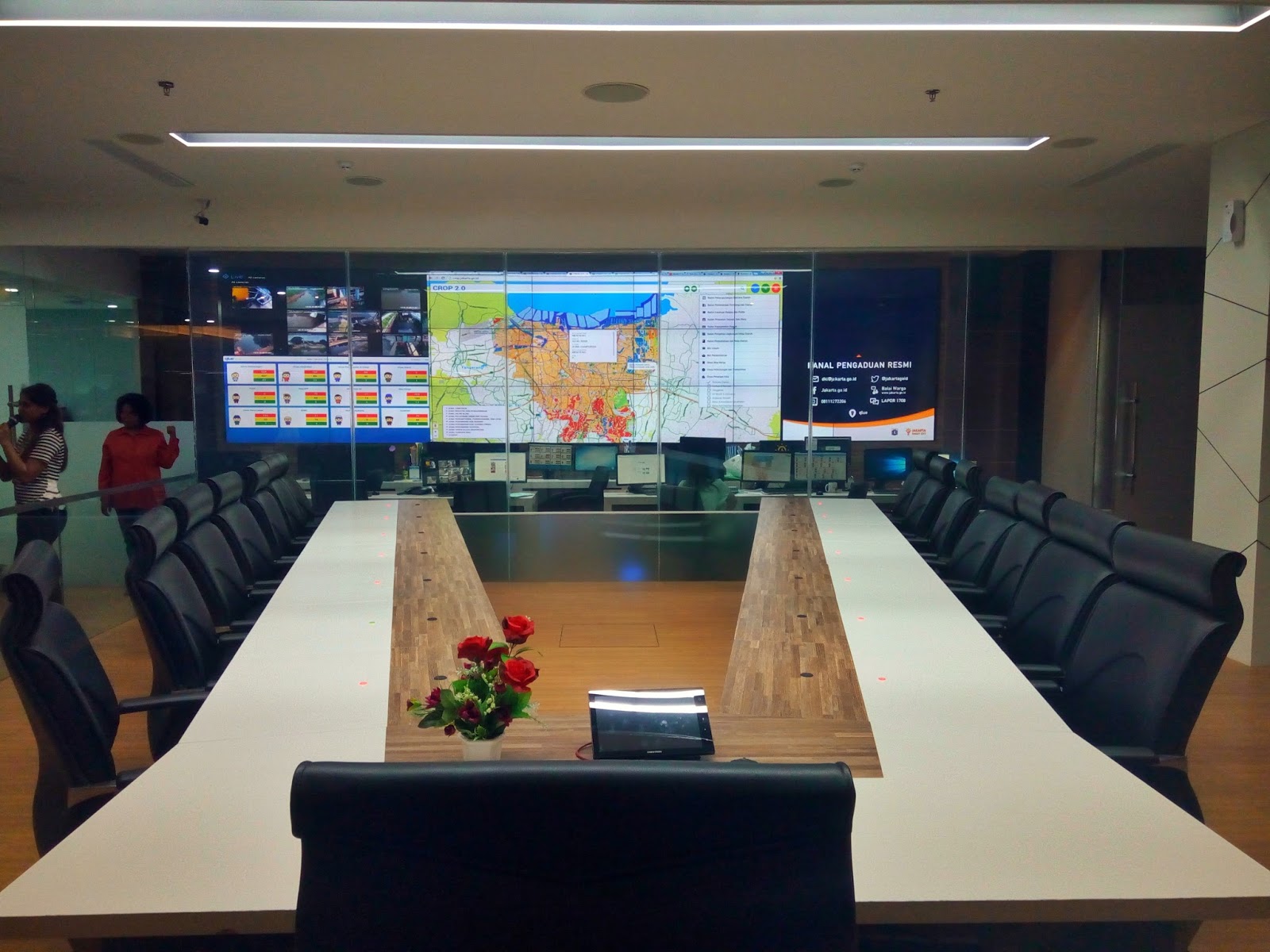 Memasuki Jakarta Smart City Lounge saya pun langsung menuju ruangan berdinding kaca yang susunan bangkunya berbentuk "V" sehingga ruangan ini disebut ruang "V" (wow), dengan layar raksasa yang memuat semua informasi tentang Jakarta melalui CCTV dan info-info update ruangan ini digunakan sebagai ruang pertemuan para "pengubah" Jakarta menuju smart city.