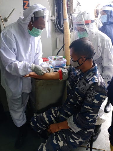 Komandan Satuan Patroli Lantamal III Kolonel Laut (P) Tarus Rostiyadi bersama Kadiskes Lantamal III Kolonel Laut (K) drg. Agung May Setiana mengadakan rapid test terhadap ABK KRI Cucut-866 di Dermaga JICT II Pelabuhan Tanjung Priok Jakarta Utara, Kamis (21/5/2020).
