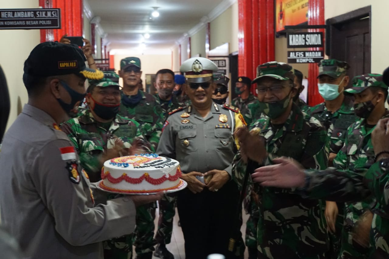 Danguspurla Koarmada I Laksma TNI Didong Rio Duta memberikan kejutan kepada Kapolres Lingga AKBP Boy Herlambang, SIK MSI pada HUT ke-74 Bhayangkara, dengan menyambangi kantor Polres Lingga secara tiba-tiba. Rabu (1/7/2020).