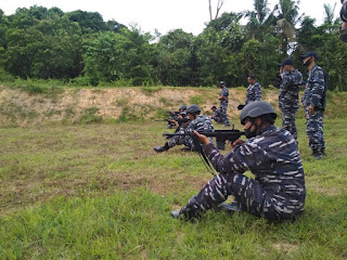 Para prajurit KRI Teluk Lampung 540 berlatih menembak senjata jenis Pistol P2 dan M4. Mereka dipandu instruktur tembak dari Pangkalan Utama TNI Angkatan Laut (Lantamal) XIII Tarakan.