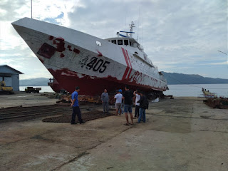 Jakarta, Rabu 26 Febuari 2020 (Humas Bakamla RI/Indonesian Coast Guard)--- Kepala Kantor Kamla Zona Maritim Timur Laksma Bakamla Arif Sumartono, S.Sos., M.Si (Han) meninjau perkembangan proses docking KN Ular Laut 405 di salah satu perusahaan docking Maluku, Rabu (26/2/20).
