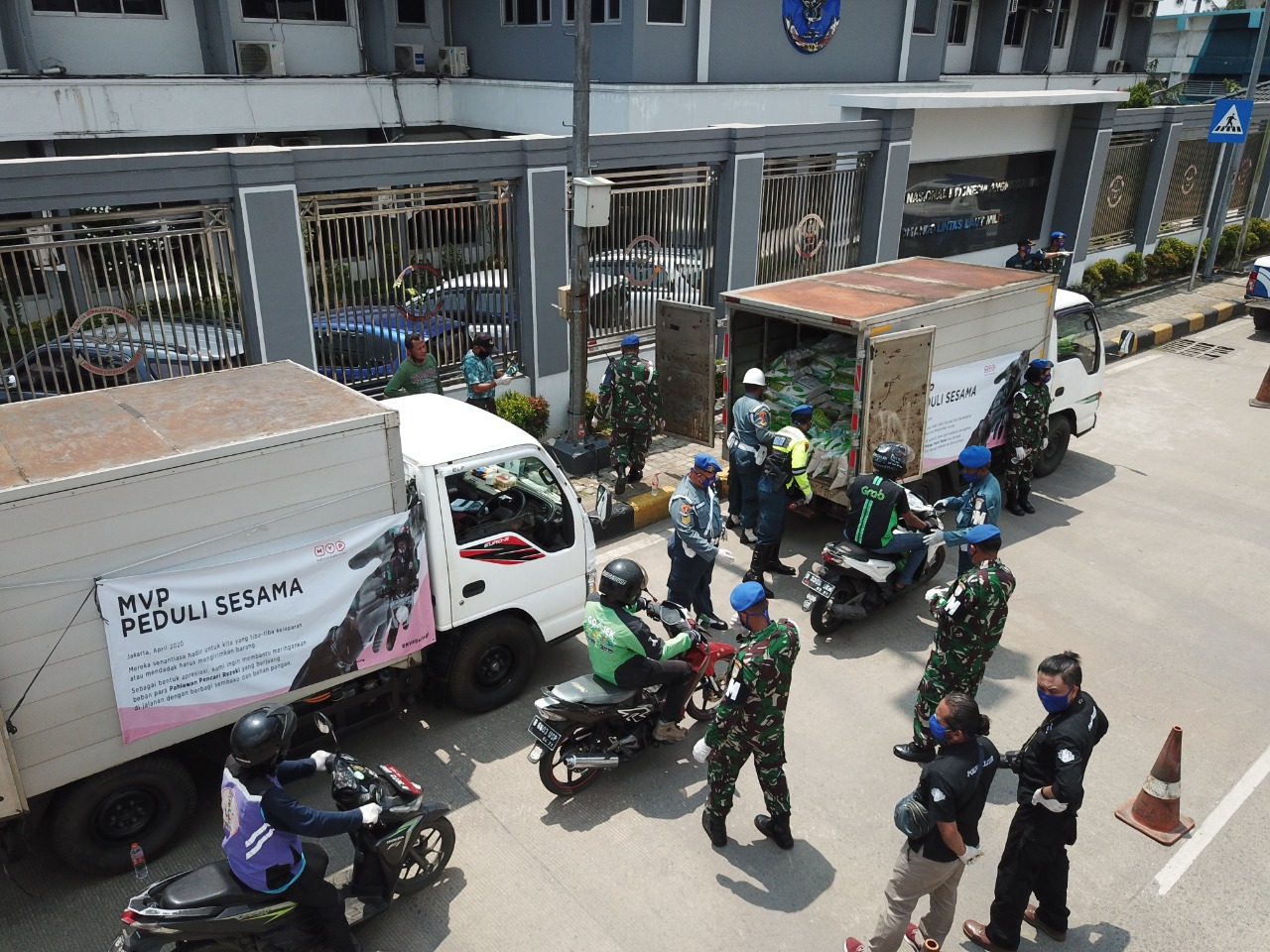 Satya Wira Jala Dharma. Multivision Plus peduli sesama diwakili oleh HRD ibu Siti Imas Masitoh bekerjasama dengan Dinas Provoos Komando Lintas Laut Militer (Kolinlamil) membagikan paket beras kepada warga terdampak pandemi covid-19 di wilayah Jakarta Utara. Kali ini yang menjadi sasaran pembagian tersebut para pengemudi ojek online disekitar Pelabuhan Tanjung Priok, Senin (20/4).
