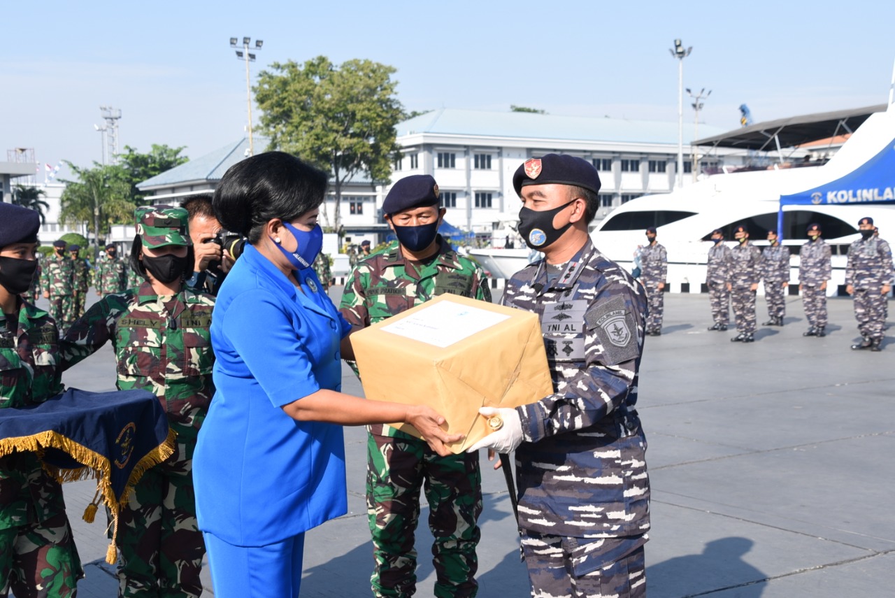 JAKARTA, 6 Juli 2020 - Satya Wira Jala Dharma. Sebagai wujud kepedulian dimasa Fase New Normal, Pengurus Pusat Jalasenastri memberikan sumbangan berupa Alat Pelindung Diri (APD) dan Face Shield kepada unsur-unsur jajaran Komando Lintas Laut Militer (Kolinlamil) dalam upacara yang berlangsung di Lapangan Mulyono Silam, Mako Kolinlamil, Tanjung Priok, Jakarta Utara, Senin (6/7).