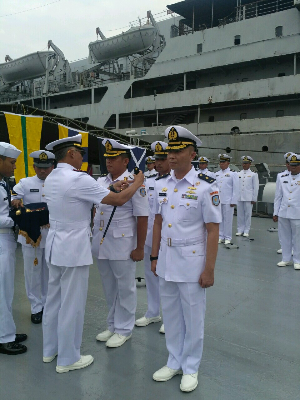 Jakarta, 14 Desember 2019 - Satya Wira Jala Dharma. Komandan Satuan Lintas Laut Militer (Satlinlamil) Jakarta Kolonel Laut (P) Hery Winarno, memimpin upacara Serah Terima Jabatan (Sertijab) Komandan KRI Mentawai 959, dari Mayor Laut (P) Joni Hari Purnomo, S.T., kepada Mayor Laut (P) Asri Wahyudi, S.H., M.Tr Opsla di Geladak KRI Teluk Amboina 503, di Dermaga Kolinlamil, Tanjung Priok, Jakarta Utara, Jumat (13/12).