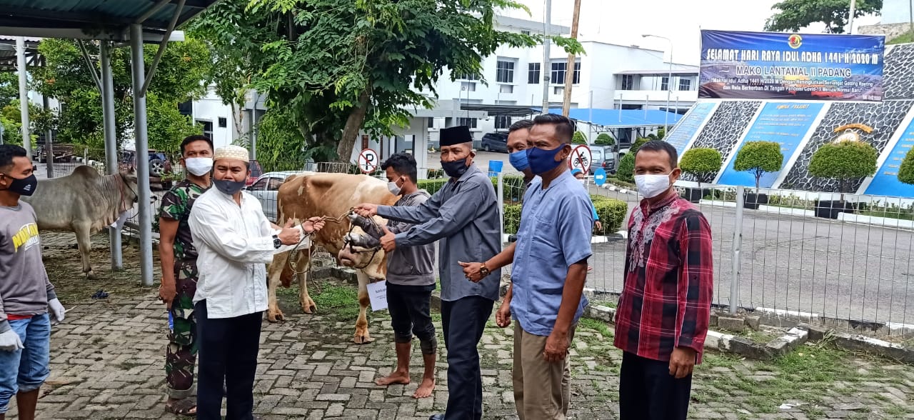 Panitia penyembelihan hewan qurban Mako Lantamal II pada tahun ini total menyembelih dan membagikan daging hewan qurban 6 ekor sapi dan 6 ekor kambing. Penyembelihan dilaksanakan di halaman parkir Mako Lantamal II, Jalan Bukit Peti-Peti, Teluk Bayur Padang, Jumat (31/7/2020).