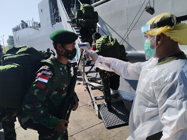 Jakarta, 21 Agustus 2020 - KRI Teluk bintuni 520 yang berada di bawah pembinaan Satuan Lintas Laut Militer (Satlinlamil) Surabaya mengangkut pasukan TNI-AD Yonif 500 Raider dan Yonif 432 Waspada Setia Jaya yang akan melaksanakan tugas Pengamanan daerah Rawan. Kapal jenis angkut Tank Leopard ini berangkat dari Dermaga Semampir, Surabaya, Rabu (19/8)