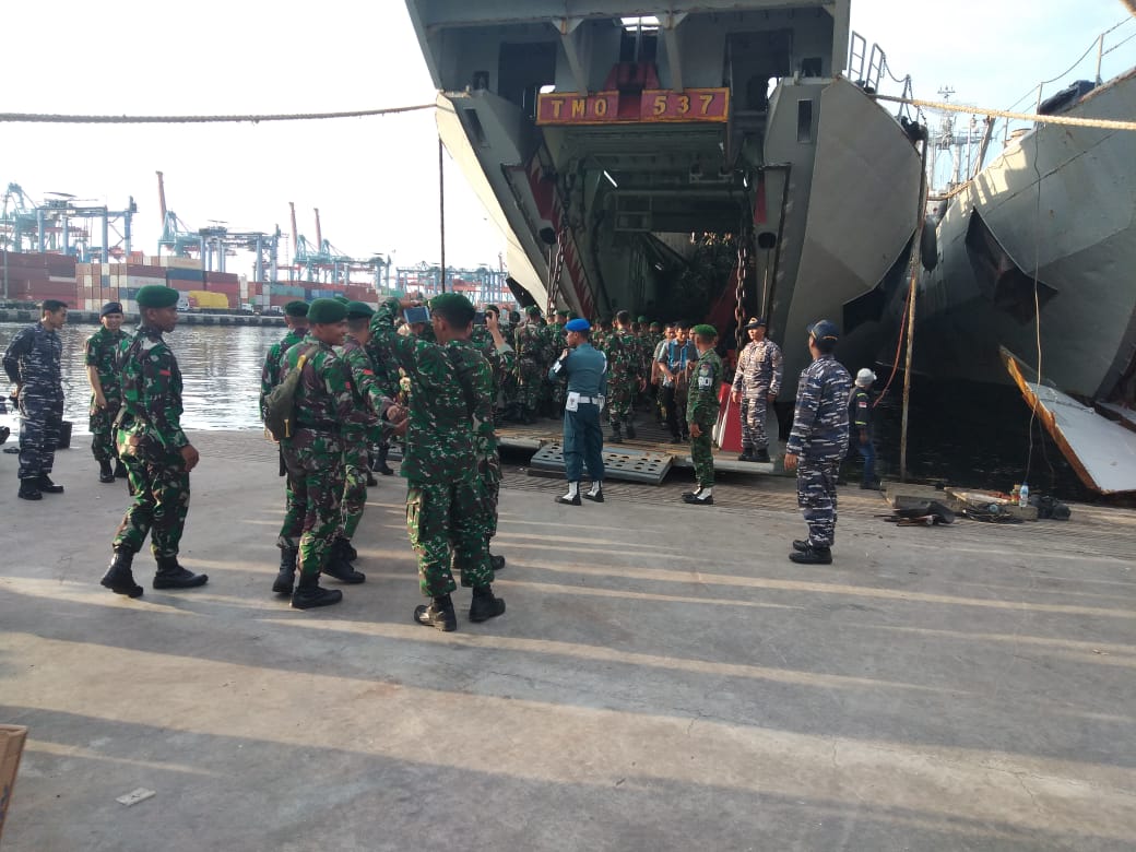 Jakarta, 26 Februari 2020 - Satya Wira Jala Dharma. KRI Teluk Manado 537 mendukung operasi angkutan laut Militer mengangkut 2 Batalion Zeni TNI AD untuk Tugas Pemulihan Gempa di Lombok. Kapal perang jenis LST ini akan menuju Lombok setelah melaksanakan embarkasi 200 prajurit dari 2 Batalion Zeni .