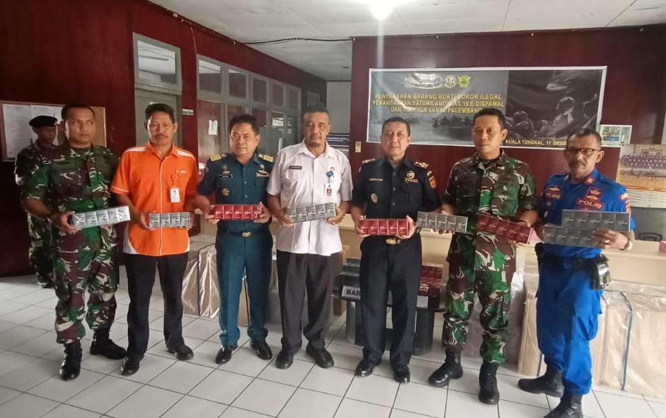 Bertempat di Kantor Bea dan Cukai Kuala Tungkal Jambi, Rabu (11/12/2019), Komandan Lanal Palembang Kolonel Laut (P) Saryanto melaksanakan Press Release sekaligus dilaksanakan penyerahan barang bukti hasil tangkapan berupa rokok ilegal sebanyak 470 kotak dengan nilai 1,6 Milyar yang ditangkap oleh Satgas Andalas Dispamal bekerjasama dengan Tim F1QR Lanal Palembang.