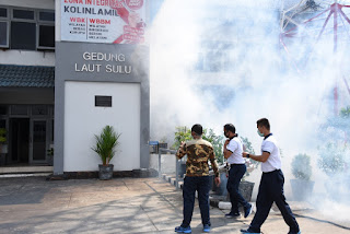 Satya Wira Jala Dharma. Meski dunia sedang terjangkit wabah virus corona atau covid 19, tentu juga bukan berarti apatis dengan penyakit lain yang juga cukup berbahaya seperti DBD atau Demam Berdarah Dengue. Memasuki pancaroba musim hujan ke musim panas, Demam Berdarah merupakan penyakit yang harus diwaspadai. Untuk mengantisipasi hal tersebut, petugas Dinas Kesehatan Komando Lintas Laut Militer (Kolinlamil) melakukan pengasapan (fogging), di Mako Kolinlamil, Tanjung Priok, Jakarta Utara, Jumat (24/4).