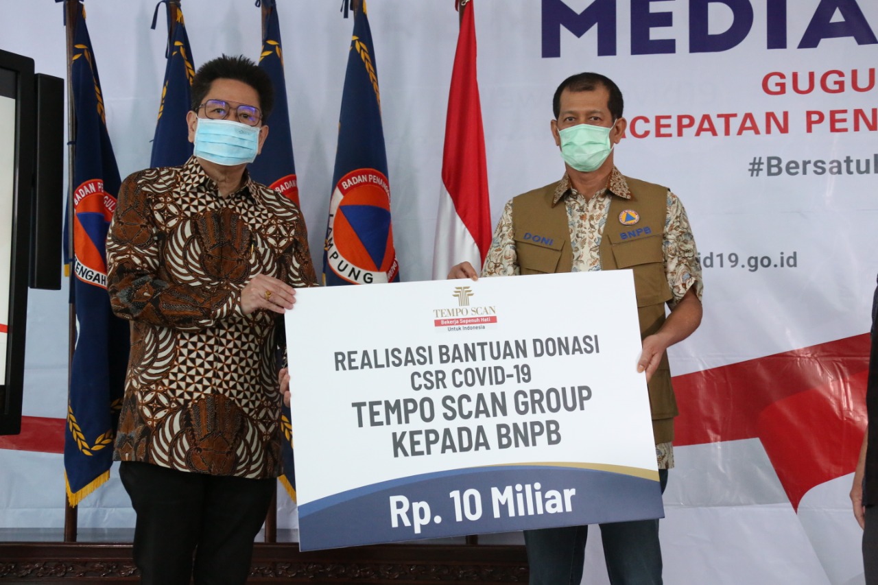 JAKARTA - Lembaga Biologi Molekuler (LBM) Ejkman mendapat sumbangan dana penguatan laboratorium pemeriksaan COVID-19 sebesar Rp 10 miliar dari PT Tempo Scan Pasific, Tbk di kantor Graha Badan Nasional Penanggulangan Bencana (BNPB), Jakarta, Jumat (3/4).