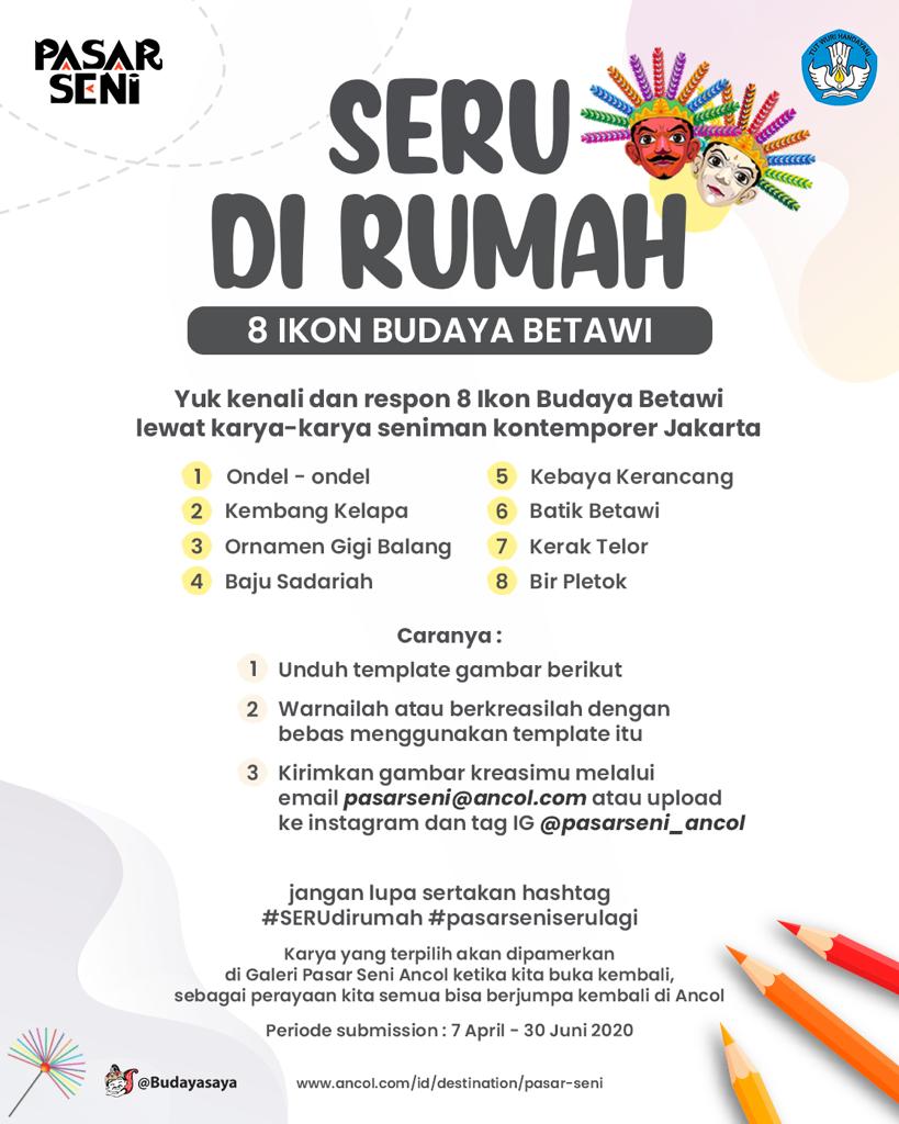 Jakarta - Adanya situasi pembatasan sosial untuk memutus rantai pandemi virus Covid-19 saat ini berdampak kepada pembatasan kegiatan edukasi dan pagelaran seni budaya. Pasar Seni Ancol pun mensiasati keadaan dengan program edukasi seni budaya agar warga tetap betah berkegiatan di rumah dengan tajuk Seru Dirumah, mengangkat 8 ikon Budaya Betawi.