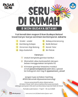 Delapan seniman kontemporer popular Jakarta akan menciptakan gambar template digital dari 8 ikon Budaya Betawi, yaitu Ondel-ondel,Gigi Balang, Kembang Kelapa, Batik Betawi, Baju Sadariah, Kebaya Kerancang, Bir Pletok, dan Kerak Telor.Baca Selengkapnya.https://kaksumiyati.blogspot.com/2020/04/pasar-seni-gulirkan-seru-dirumah-angkat.html?m=1