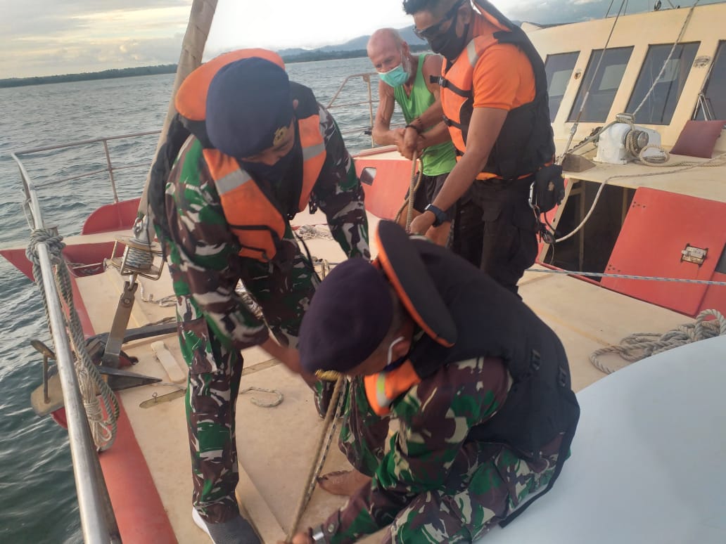 Posal Muntok jajaran Lanal Bangka Belitung bersama Gugus Tugas Covid-19 menerapkan Standar Operasional Prosedur (SOP) Covid-19 kepada Nakhoda Kapal Yatch Berbendera Australia yang sehari sebelumnya mengalami kerusakan mesin dan berlabuh di Pantai Pelabuhan Perikanan Muntok, Minggu (10/5/2020).