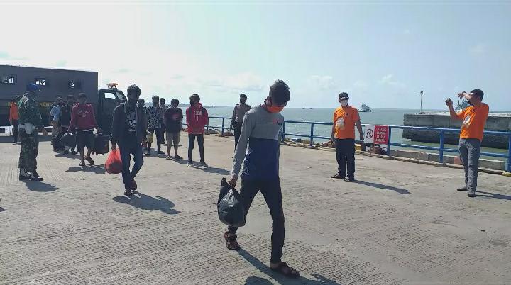 Atas perintah Danlanal Bangka Belitung Letkol Laut (P) Dudik Kuswoyo selaku Dansatgas Angkutan Laut (Angla) melalui Danposal Muntok yang tergabung dalam Satgas Angkutan Laut Covid-19 bersama Gugus Tugas Covid-19 Kabupaten Bangka Barat melaksanakan pengembalian 13 orang penumpang gelap ke daerah asal bertempat di Pelabuhan Tanjung Kalian Muntok, Kabupaten Bangka Barat, Bangka Belitung, Minggu (7/6/2020).