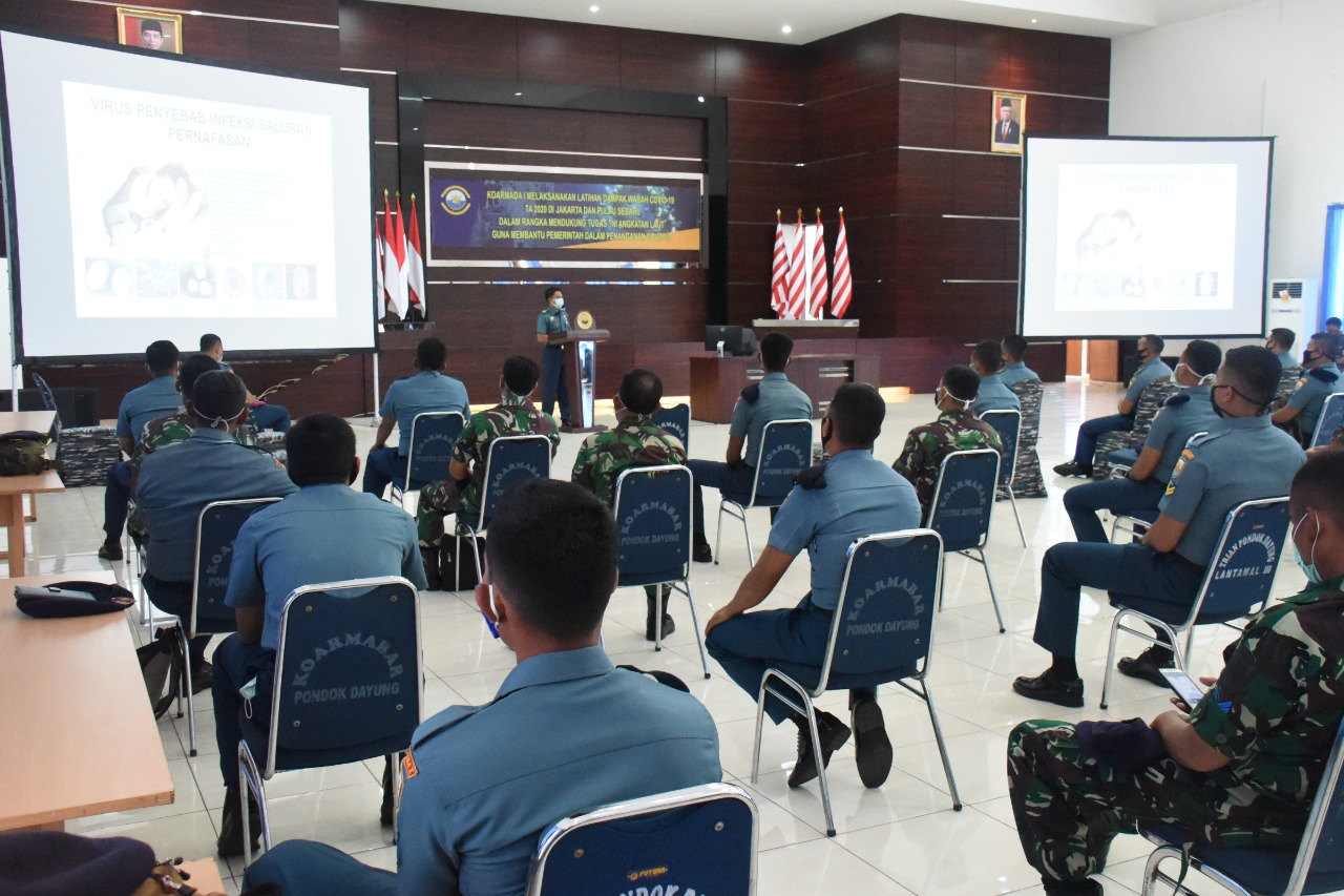 Dalam upaya mencegah penyebaran virus Corona (Covid-19) khususnya di lingkungan Koarmada I, Satgas Percepatan Penanganan Dampak Covid-19 memberikan pembekalan terkait Covid-19 dan prosedur pemakaian APD (Alat Pelindung Diri), Rabu (8/4) kepada seluruh prajurit yang berada di Kesatrian Koarmada I Pondok Dayung.