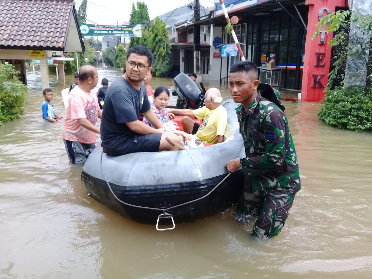 Sejumlah wilayah di Jakarta kembali terendam banjir, sejak hujan mengguyur senin malam hingga pagi tadi, tidak terkecuali daerah Sunter dan jati bening sekitarnya. Tim Satgas Banjir Lantamal III dari Yonmarhanlan III dibawah pimpinan Letda Mar Hepri dan Letda Mar Sujatmiko bantu evakuasi warga yang terkena dampak banjir di daerah Sunter Kodamar dan Jati Bening, Jakarta Utara, Selasa (25/2/2020).