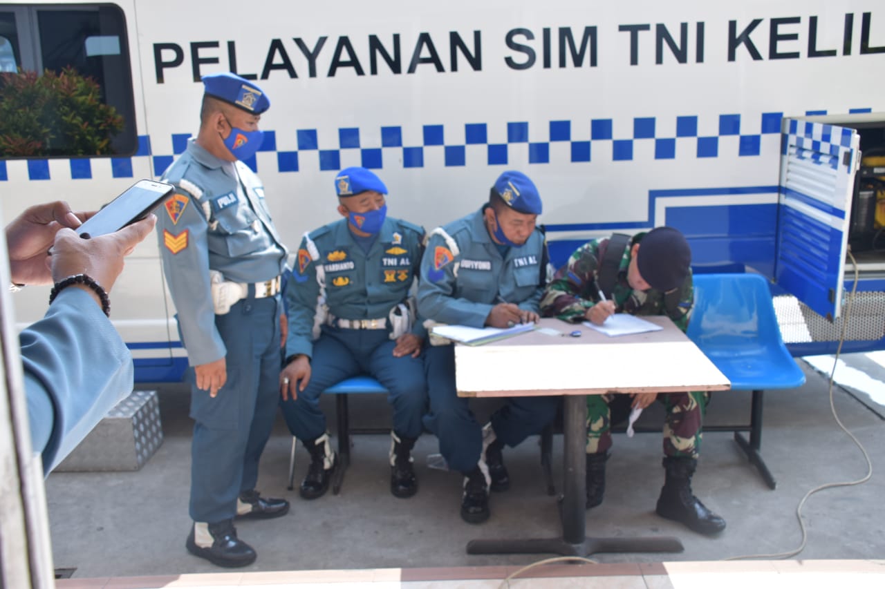 Mobil SIM Keliling POM TNI AL Lantamal III Jakarta menyambangi Markas Komando Lintas Laut Militer (Kolinlamil), untuk memfasilitasi kemudahan pengurusan SIM TNI, Senin (29/6).